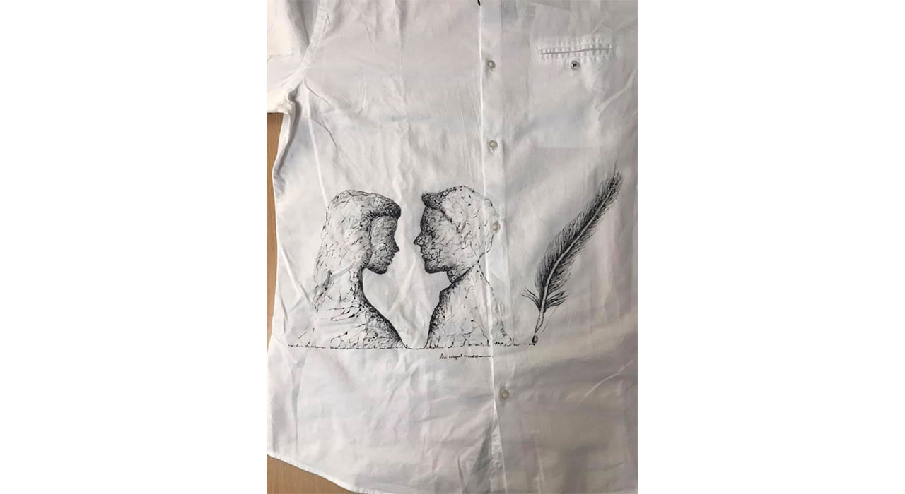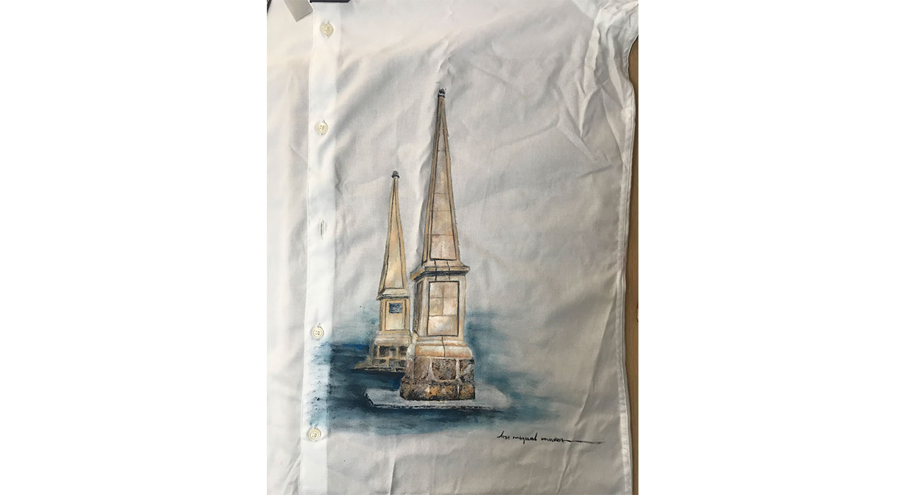 Camisa pintada a mano para la inauguración de la exposición colectiva "NAVEGAMOS" de Los Alcáceres en 2017.