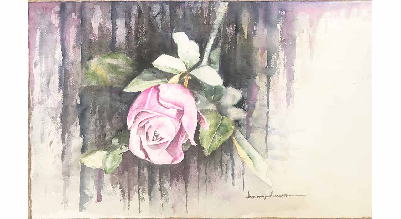 El rosal que tiene el artista en su casa de Santomera es una especie que produce rosas durante todo el año pero solamente duran un día abiertas.Tiene tendencia a salir mirando al suelo o de espaldas. Solamente las más altas crecen mirando al cielo como es el caso de esta que tenemos aquí