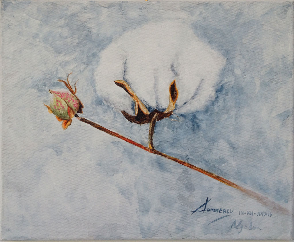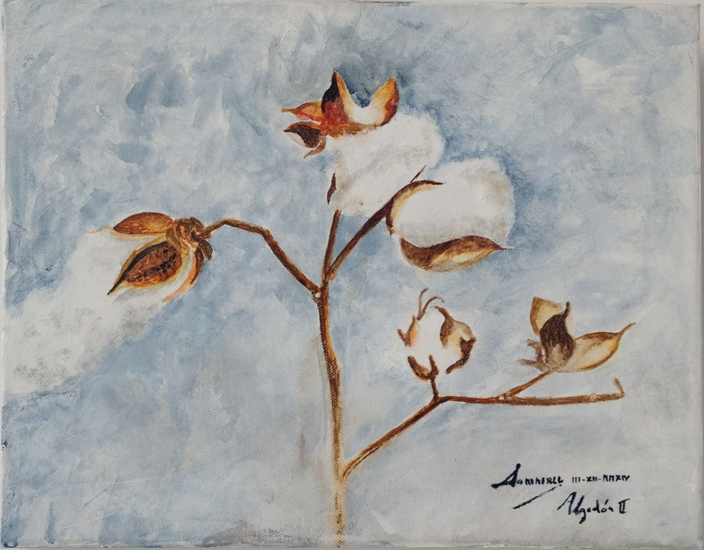 Con estas dos obras dedicadas a la planta del algodón, el pintor Murciano quiere enfrentar la rudeza de la vaina y la planta en si que protege a las fibras tan delicadas con eso pinchos que tanto dolor causaban a las gentes que se dedicaban a recoger el algodón a mano. Dos obras muy sutiles donde se muestran las plantas a tamaño real.