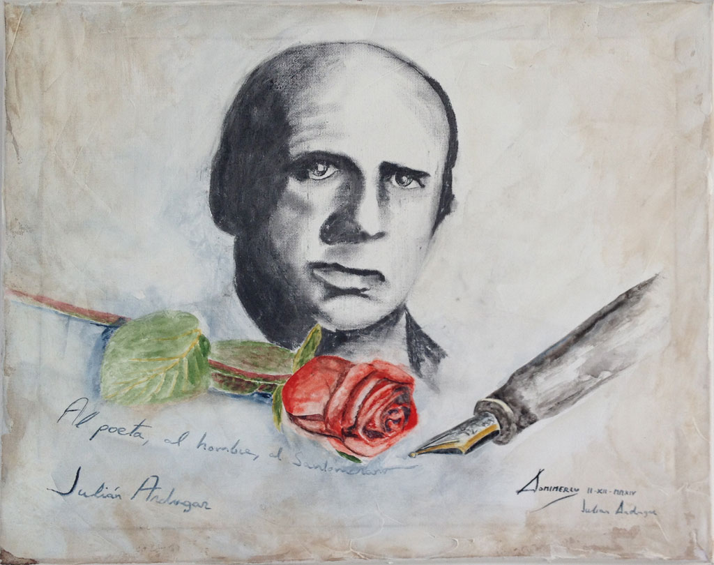 Maestro, poeta y senador. JOMIMERLU en este cuadro homenaje al poeta, al hombre, al Santomerano, realizado con técnicas mixtas sobre lienzo, ha querido realzar sobre todo la figura del poeta, con una de las pocas imágenes que hay de él, con la herramienta típica de todo escritor y su condición de politico socialmente comprometido.