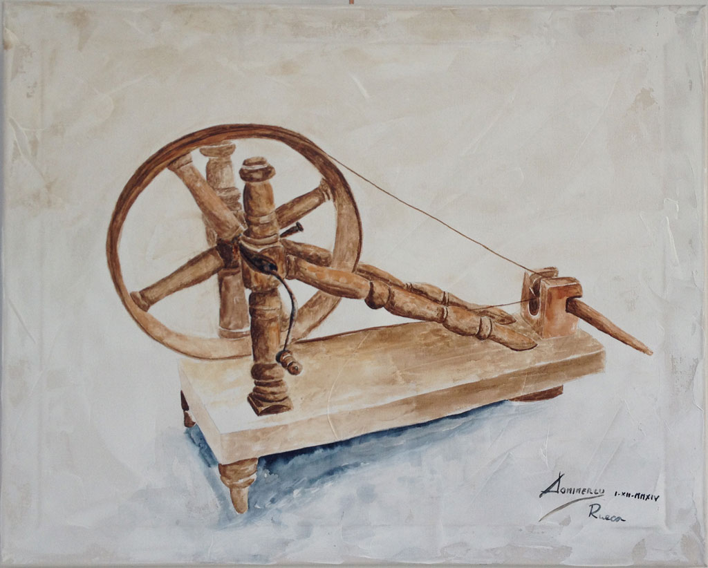 Herramienta posterior al Huso y precursora de las modernas máquinas de hilar, que permitia dar velocidad al proceso de hilado del algodón y la lana. En este caso el pintor muestra una rueca manual, pero habia otros modelos que se hacian girar con un pedal.